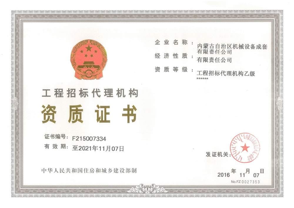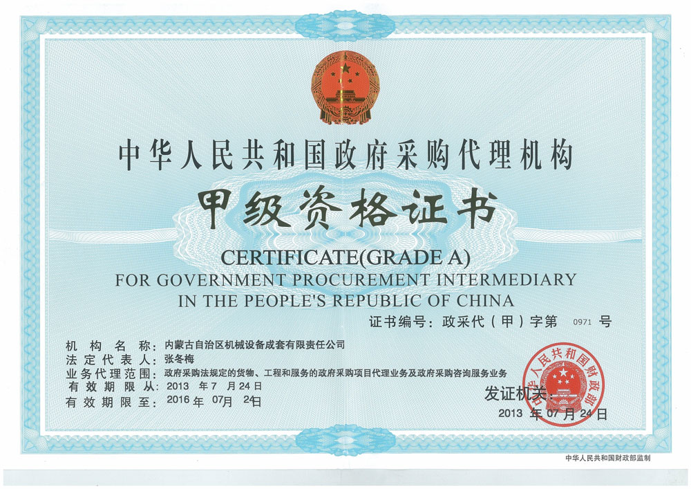 中央投資項目招標(biāo)代理機構(gòu)甲級資格證書